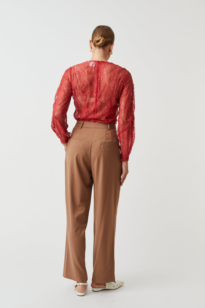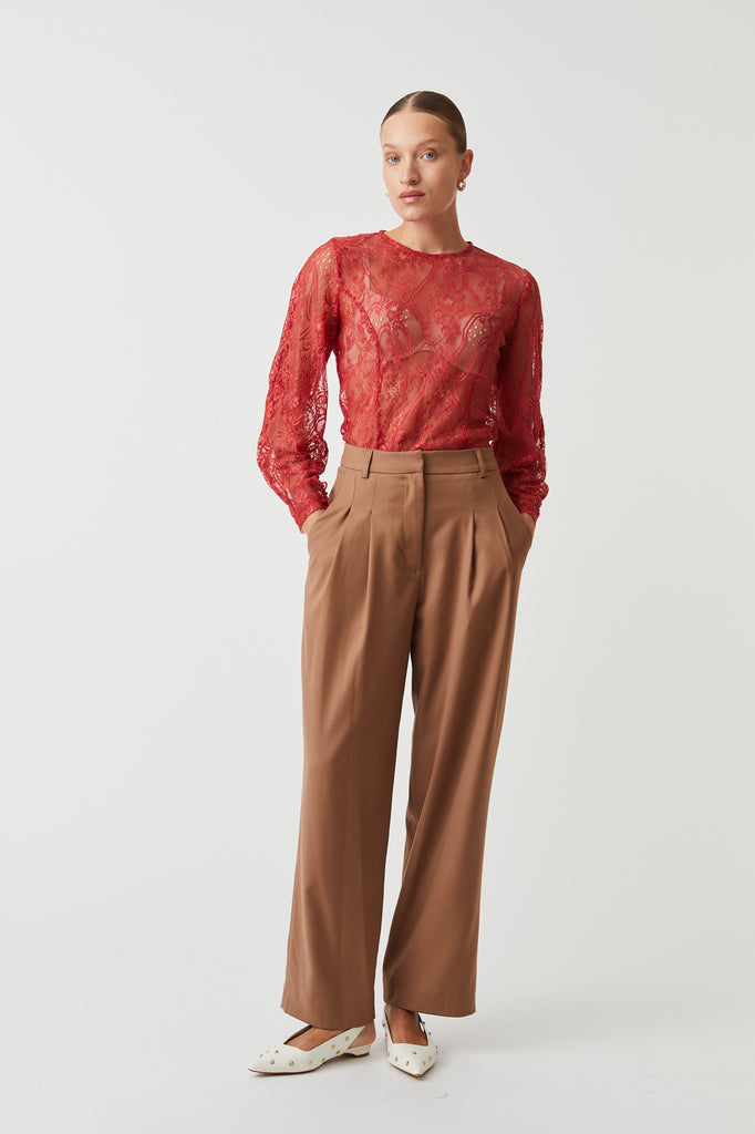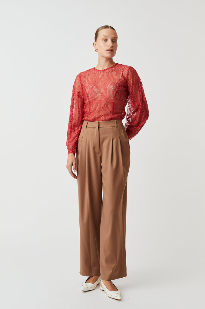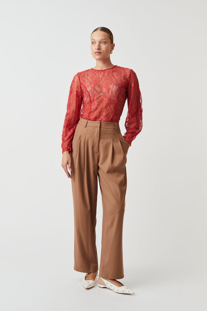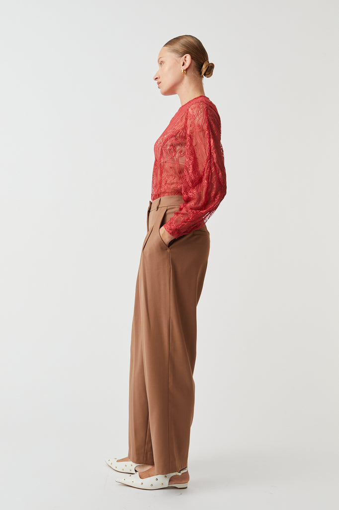 Tailored high-waist trousers with front pleats and a relaxed elongated silhouette. Design with side pockets and hook-and-bar closure for clean finish.
