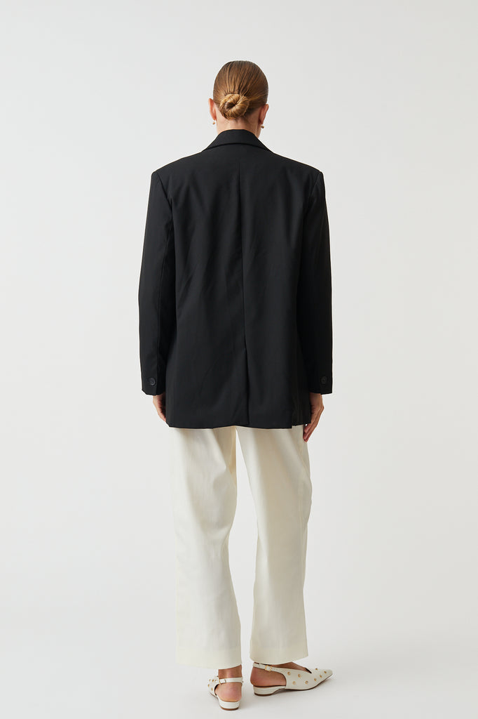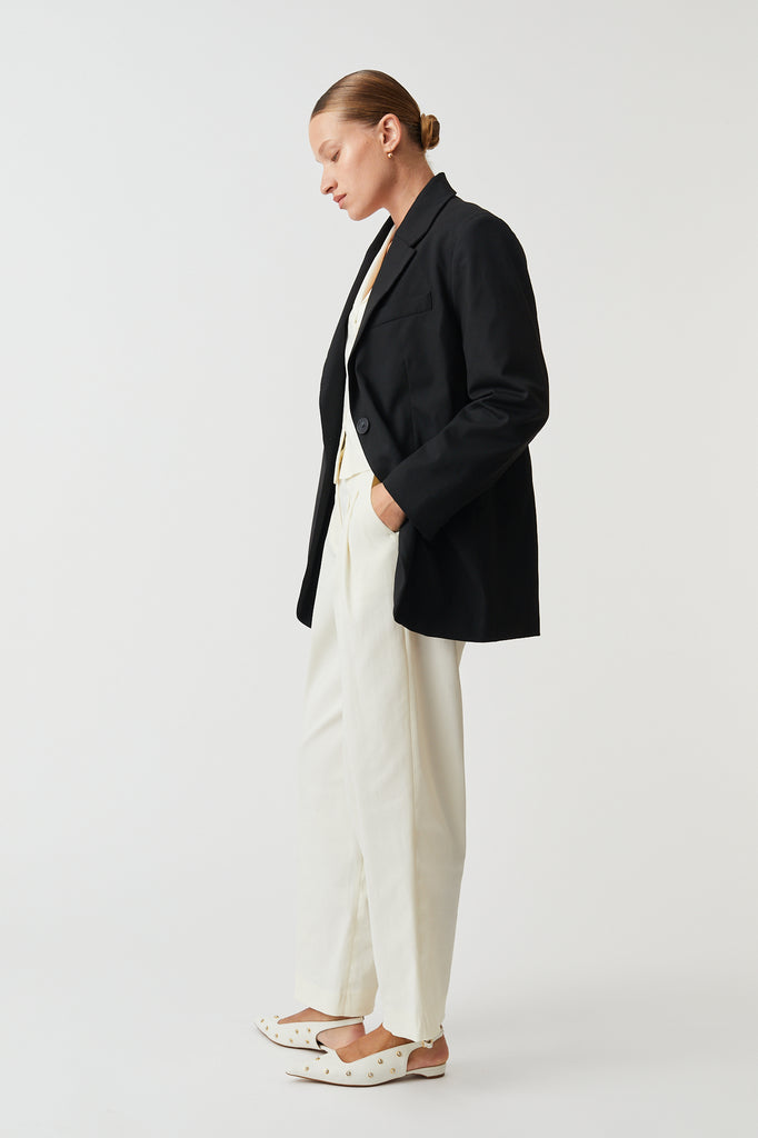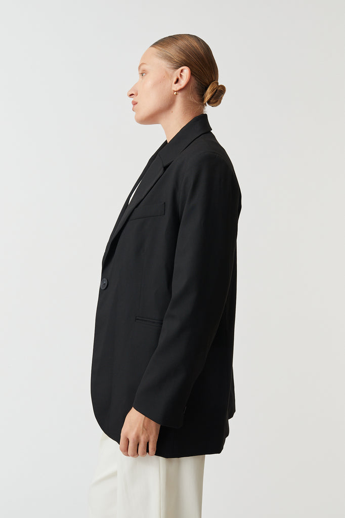 A slightly oversized tailored jacket, with a relaxed fit, fully lined for structure and comfort. Features an inside pocket for functionality.