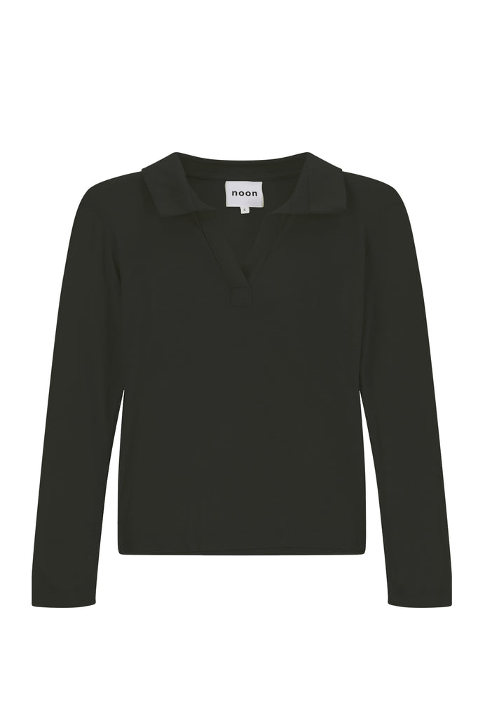 Slim fit long sleeve polo top with a classic collar and open neckline. soft and stretchy fabric for a flattering, sleek silhouette.