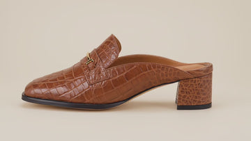 A soft square mule in crocco-embossed leather, finished with a delicate gold bar.