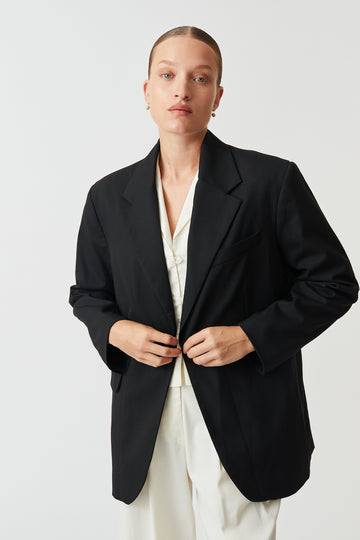 A slightly oversized tailored jacket, with a relaxed fit, fully lined for structure and comfort. Features an inside pocket for functionality.